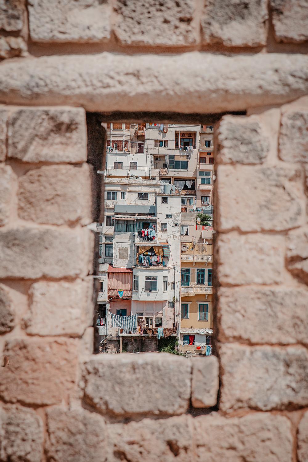 A narrow perspective onto the many lives tucked away in small spaces in a building in Tripoli, Lebanon, seen from an ancient fortress in the middle of the busy city.