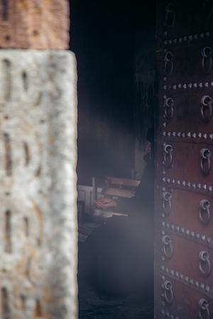 A nun inside the 14th century "Tsminda Sameba" Gergeti Trinity Church of Georgia, 2170m above level on top of a steep mountain surrounded by the vastness of more mountains.